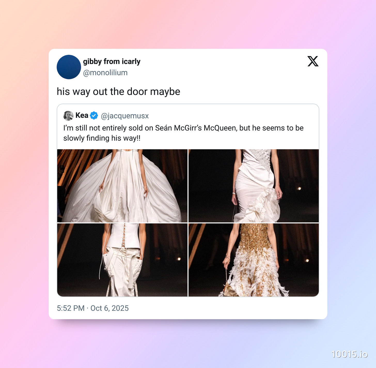 K: I was genuinely shocked to learn the house breached its debt terms (the debt-to-earnings ratio surpassed the limit in its credit agreement). Turns out Michele isn’t Jesus after all. But I’d like to believe the brand is worth saving. SS26, with all its excessive glamour and push-pull between past and present, was intoxicating. Look 28 was fab. Look 43 was my favourite; it gives the older, neurotic, rich sister of Versace. INTO IT!